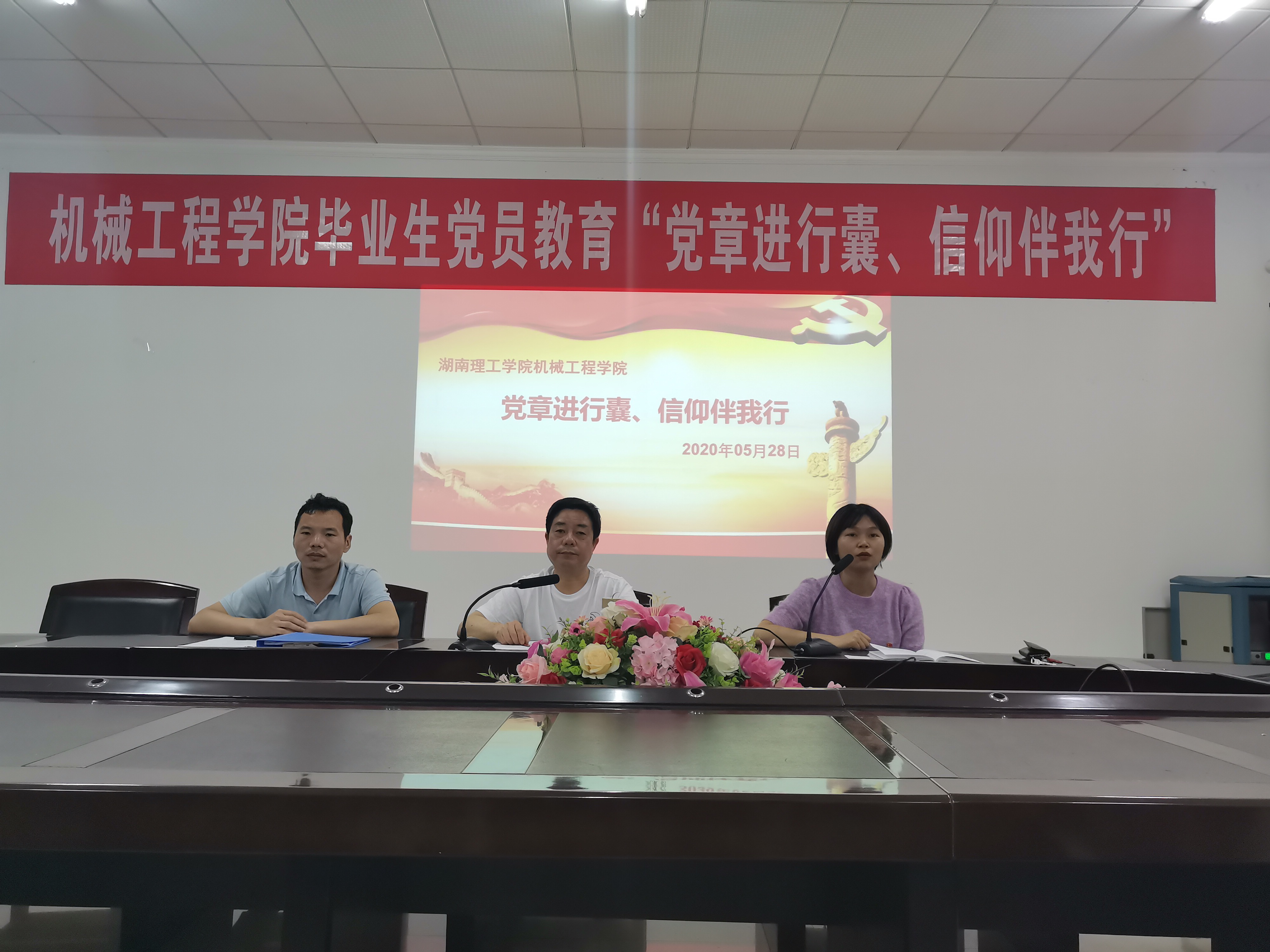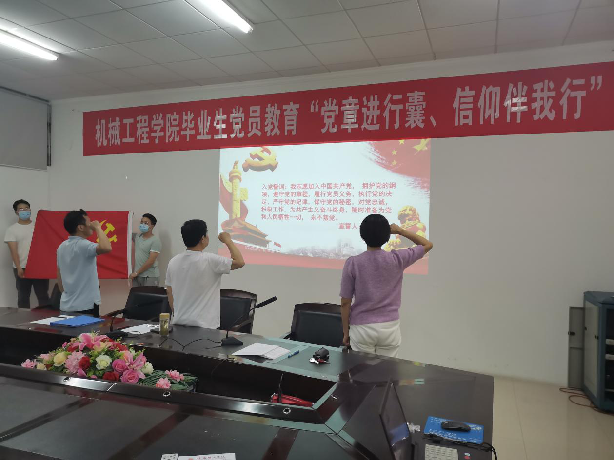 毕业生党员教育活动在庄严的国歌声中拉开序幕。全体毕业生党员面向党旗再次宣誓,通过重温誓词,牢记使命担当。