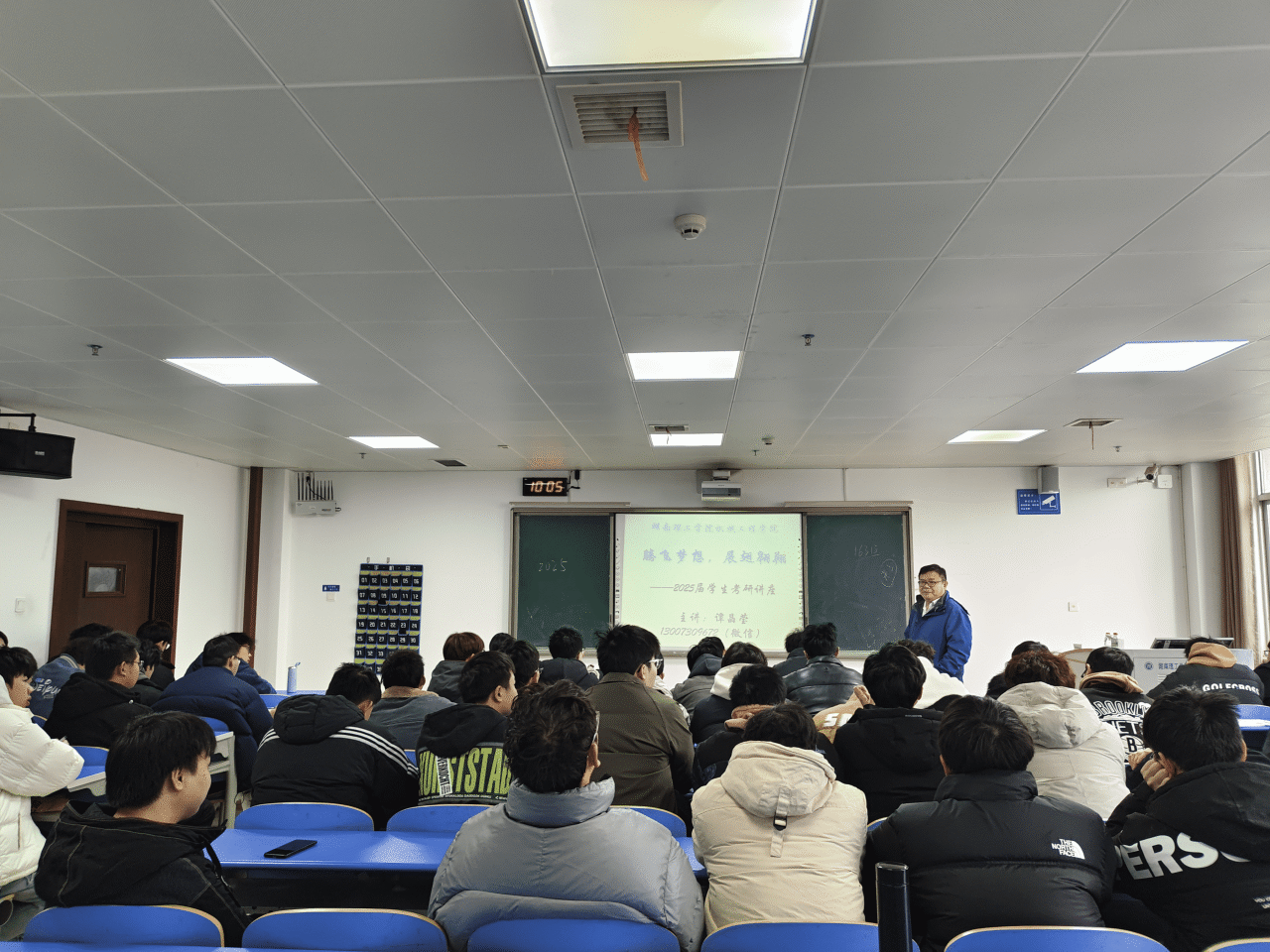 讲座开始后,谭经理以为什么要考研为出发点分析了当前考研形势;随后,向同学们介绍了公司各专业历年考研率,并与同学们一起研究了历年国家线,提醒同学们准确评估自身实力和定位自身目标;然后,他根据往届考研经验向同学们传授考研院校的选择与方法,鼓励同学们发挥自身所长,科学报考。最后,谭经理针对同学们考研疑惑进行了一一解答。